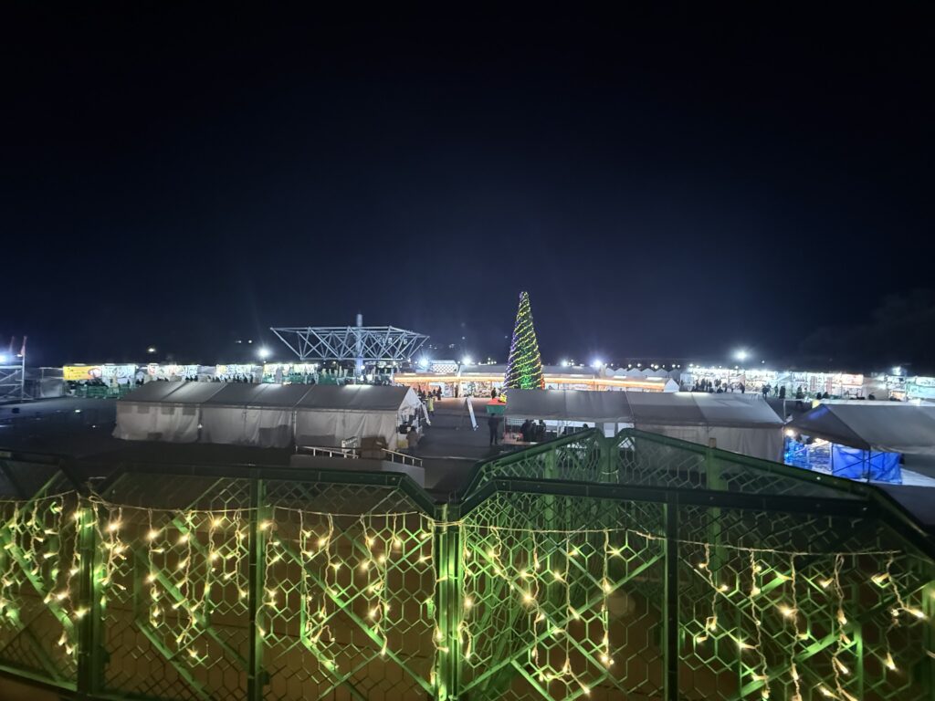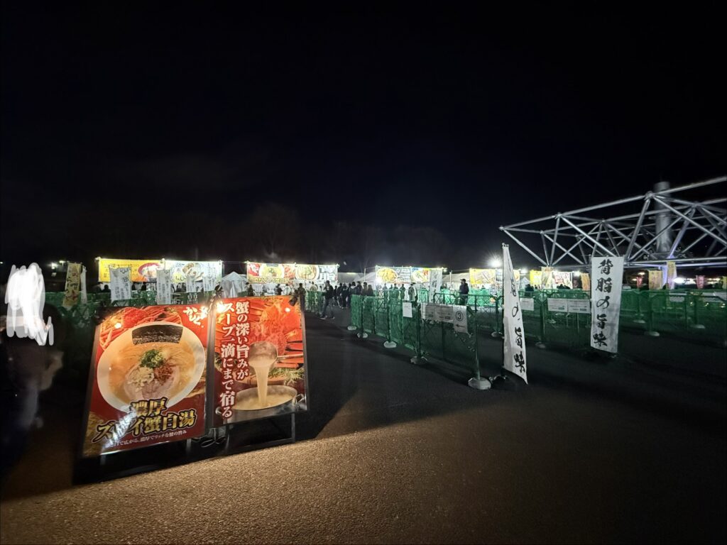 イルミナイト万博2025の会場である万博記念公園に入園し、イルミナイトの会場となっている太陽の塔を周回して奥に進むと、ラーメンエキスポの会場が見えます。
